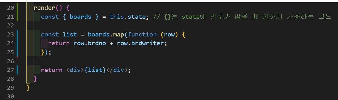 this.state에 있는 것 중에서 하나를 가지고 와야 하므로 대괄호를 사용하여 { boards }로 나타낸다