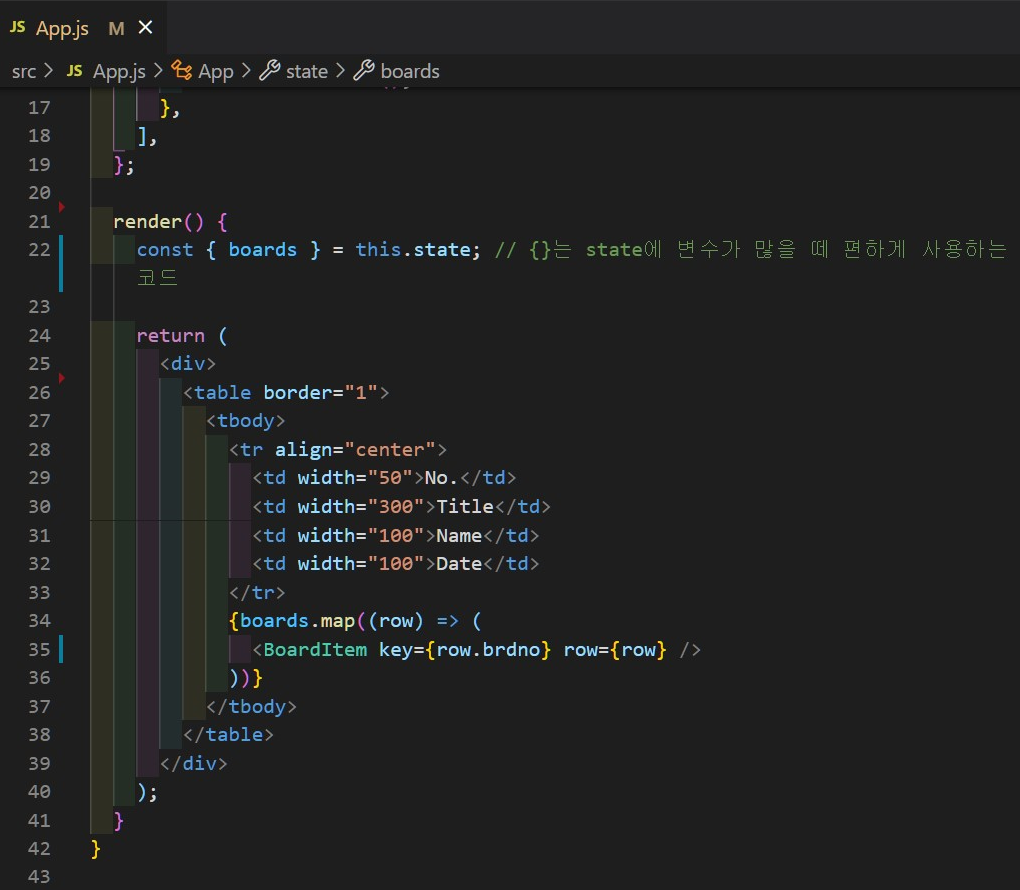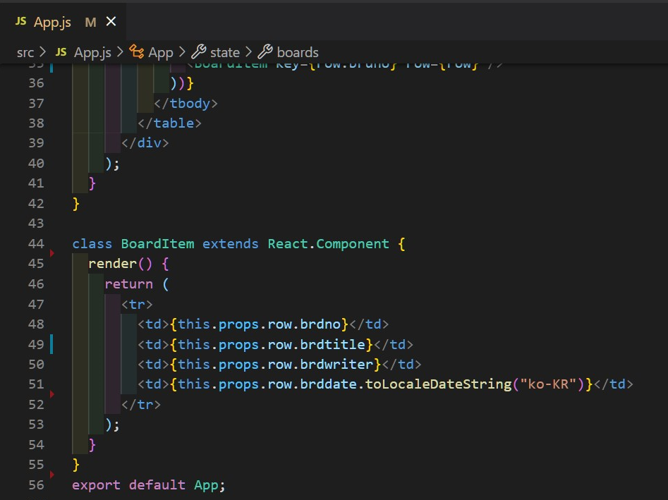 배열의 <BoardItem /> 엘리먼트는 key 값을 가지고 있어야 하기 때문에 key={row.brdno}를 지정해 줍니다.